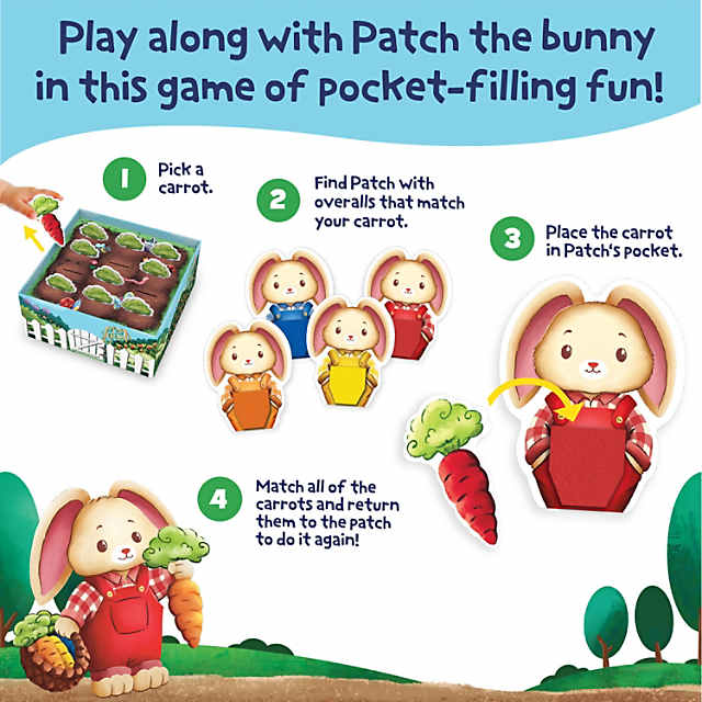Can you help these bunnies fill their pockets with tasty carrots? This color matching game takes toddlers on a playful garden adventure as they pick colorful carrots from a carrot patch, find the bunny with the matching pocket color and place the carrot inside the pocket pouch. Once all carrots are matched, return them to the patch and start the process over again! Playtime becomes a rich source of growth with this entertaining game that not only entertains but also develops crucial skills. A fun first game for little ones, Patch’s Pockets includes a parent’s guide with ideas for other ways to play, learn and explore. Invite little ones to follow the game’s rules or invent their own, letting their imagination run wild!
