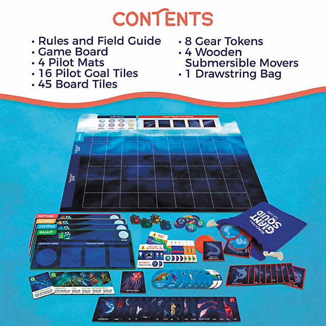 • Includes a gameboard, 4 pilot mats, 16 pilot goal tiles, 45 board tiles, 8 gear tokens, 4 wooden submersible movers, 1 drawstring bag, detailed rules and an educational field guide