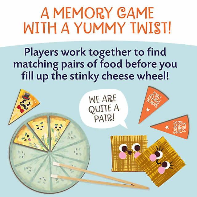 How to Play:Players take turns using tongs to flip over snack wedges, aiming to find matching pairs of delicious foods. Each successful match fills the snack board with tasty treats. But watch out! Hidden among the snacks are 10 stinky cheese wedges that can spoil the fun. If players manage to match all 13 snack ingredients before revealing all the stinky cheese wedges, everyone wins! The game also includes a magic cheese wedge and a stinky cheese wheel to add an extra layer of excitement.